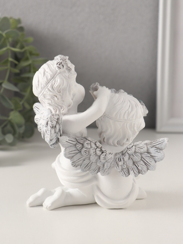 Фигурка изображает ангелочков, вплетающих венок в волосы, что создаёт трогательную и умиротворяющую композицию. Сочетание белого и серого оттенков придаёт изделию сдержанность и элегантность, делая его универсальным элементом декора для любого праздника или повседневного интерьера. Её компактные размеры позволяют легко разместить её на полке, столе или в витрине, добавляя пространству тепла и гармонии.