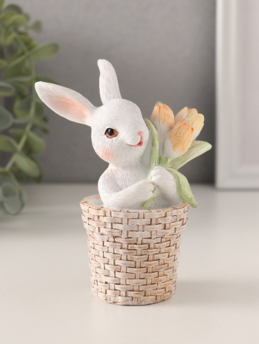 Фигурка полистоун «Белый кролик в плетёной корзине с тюльпанами», 8.5×5.5×11.5 см