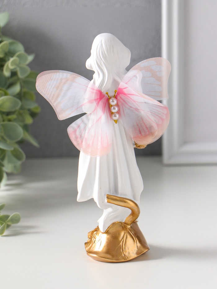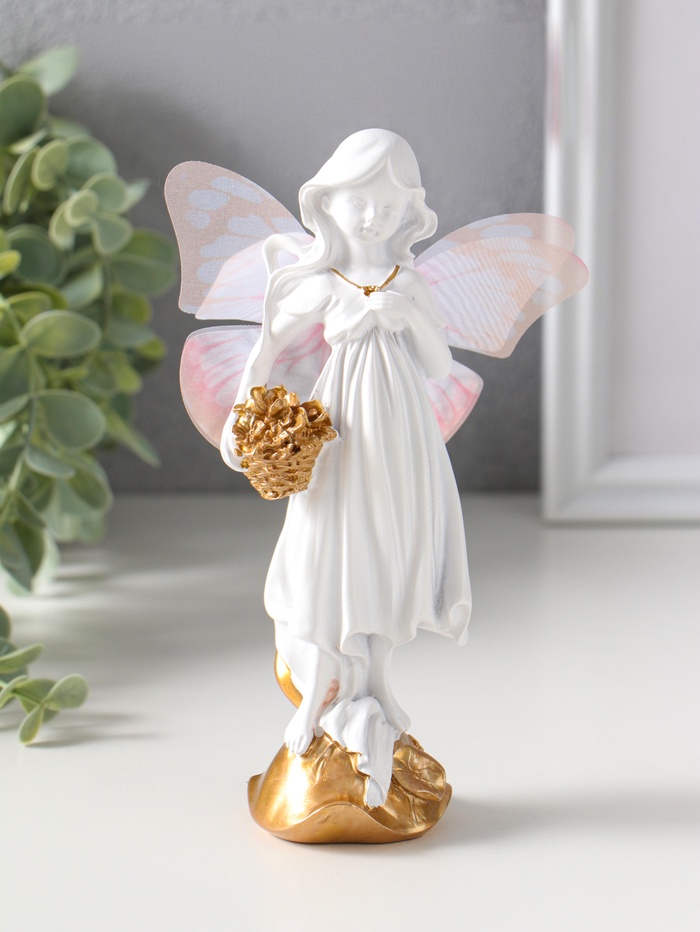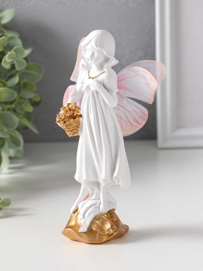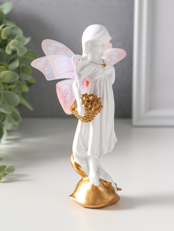 Фигурка полистоун «Девочка-бабочка с золотыми цветами в корзинке», белый, 5×6.5×17.2 см