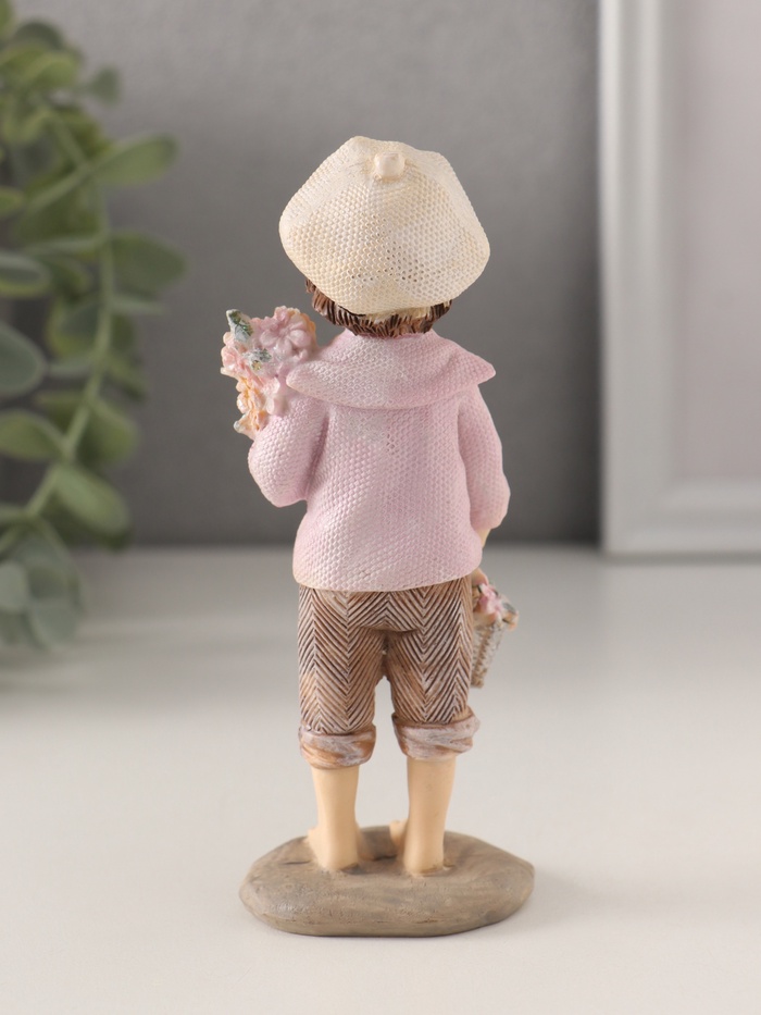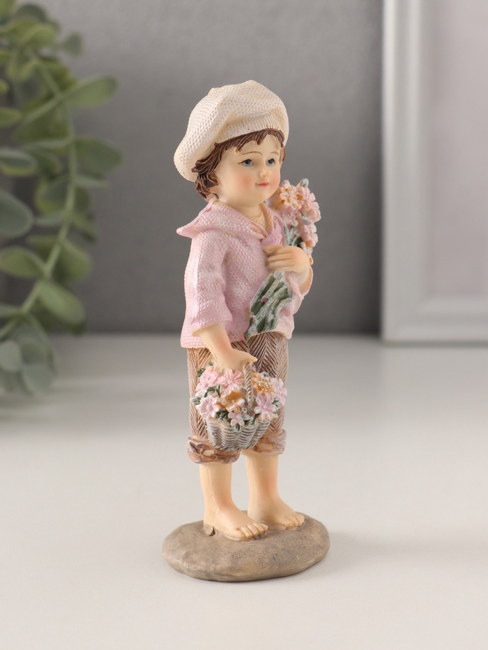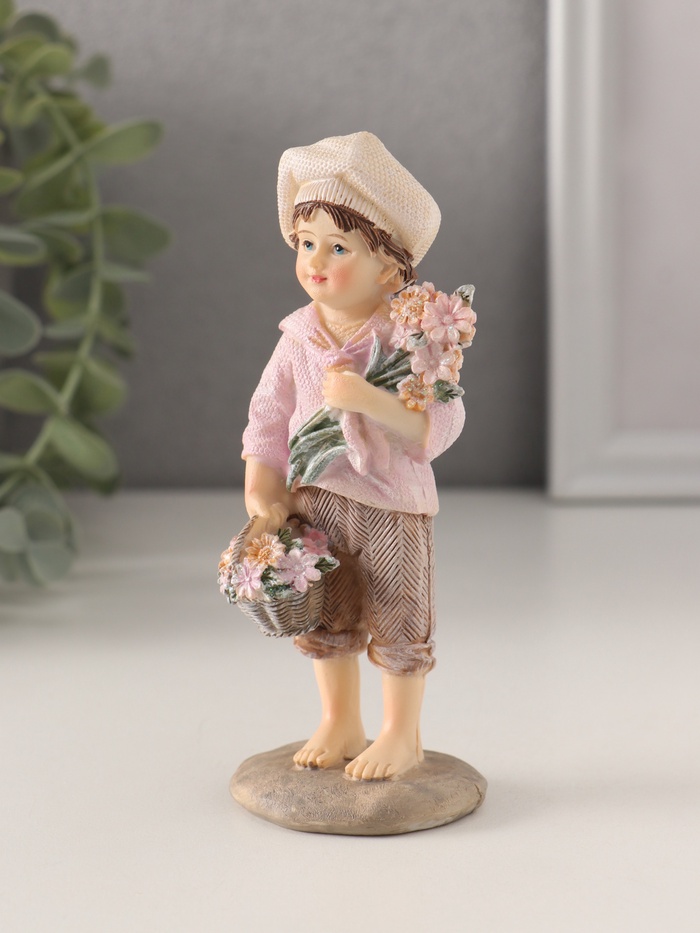 Фигурка полистоун «Мальчишка с корзиной цветов и букетом», коричнево-сиреневый, 5.5×4×12 см