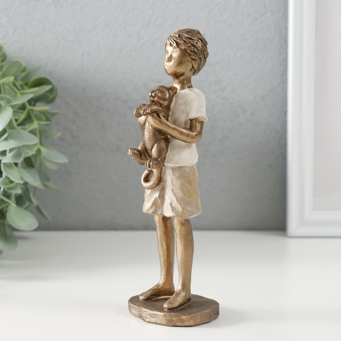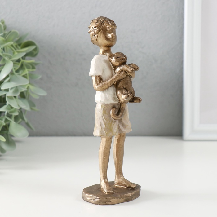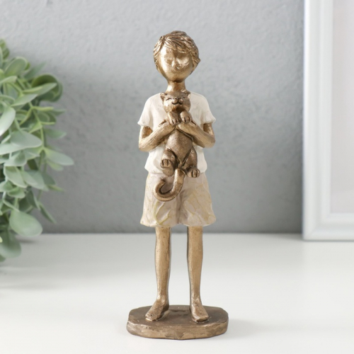 Фигурка полистоун «Мальчишка с котом», бронза, бело-песочный, 5.5×5.5×16.5 см