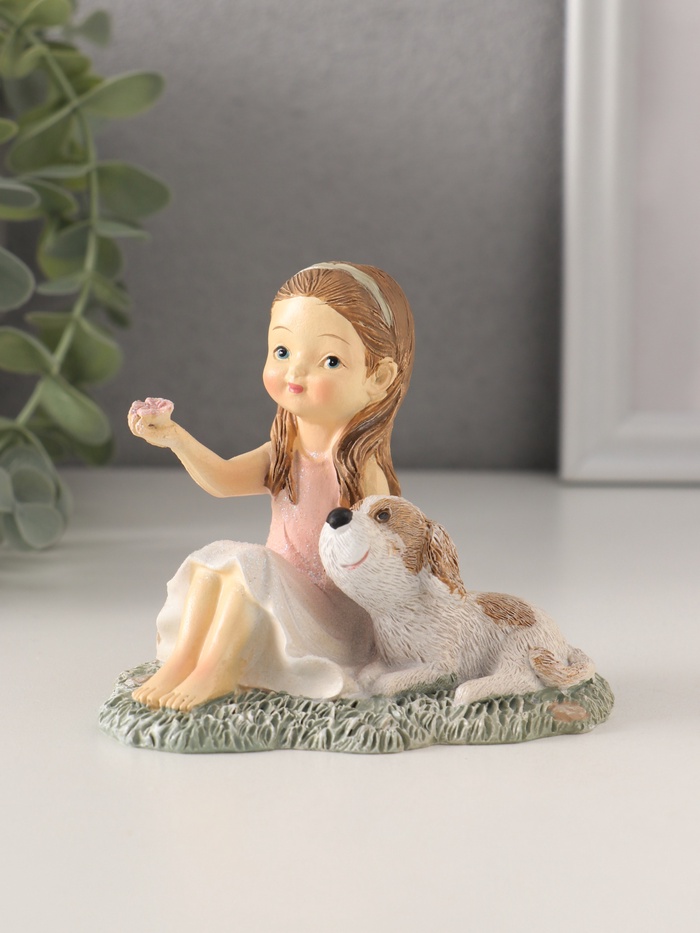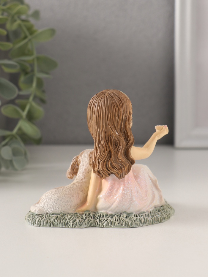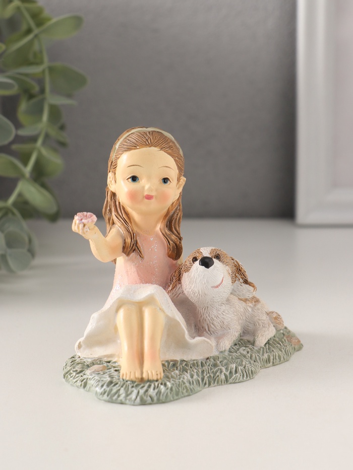 Фигурка полистоун «Малышка в розовом платье с собачкой на лужайке», 10×6.5×8.5 см