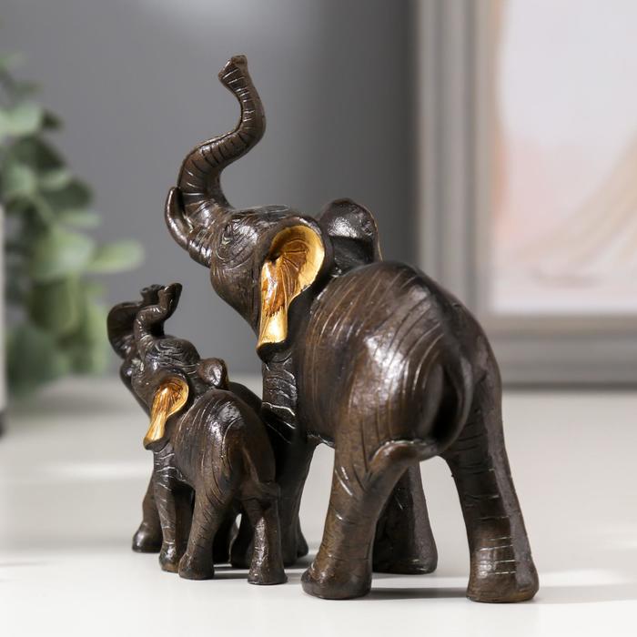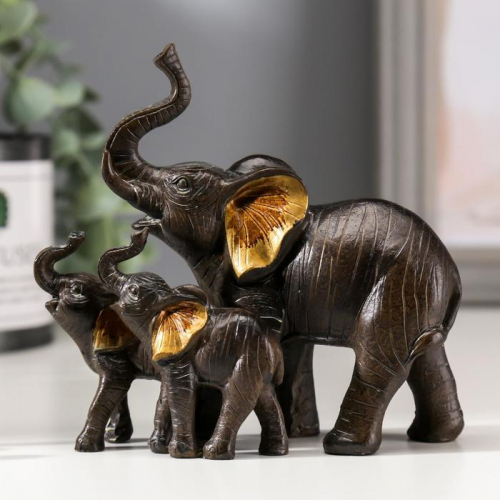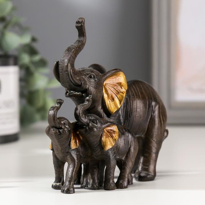 Фигурка полистоун «Слон африканский коричневый со слонятами», золотые ушки, 11×12×5.5 см
