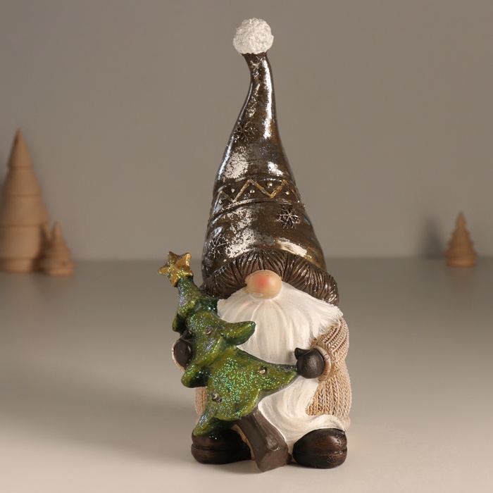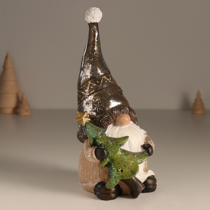 Фигурка светящаяся полистоун «Дед Мороз в колпаке, с ёлкой», беж и шоколад, 10.5×10.5×22 см