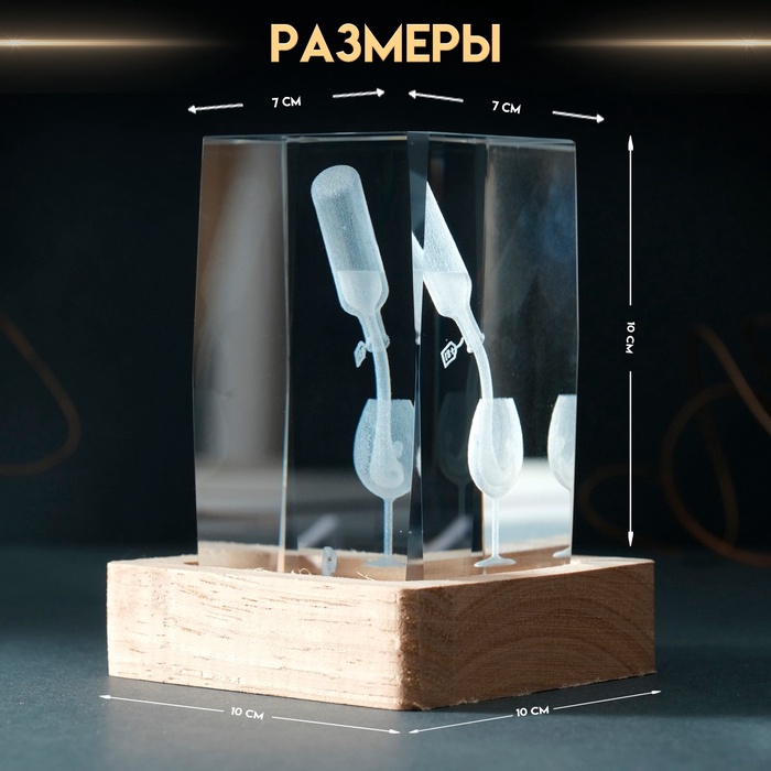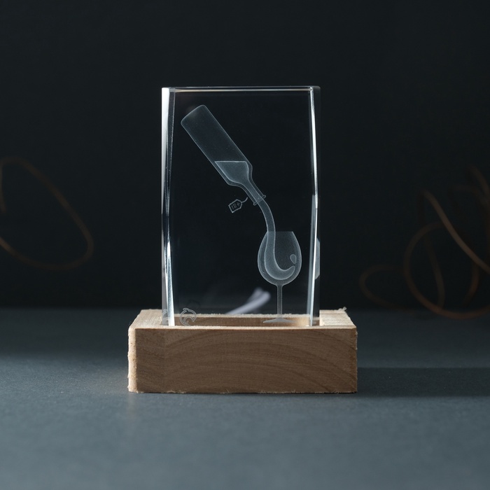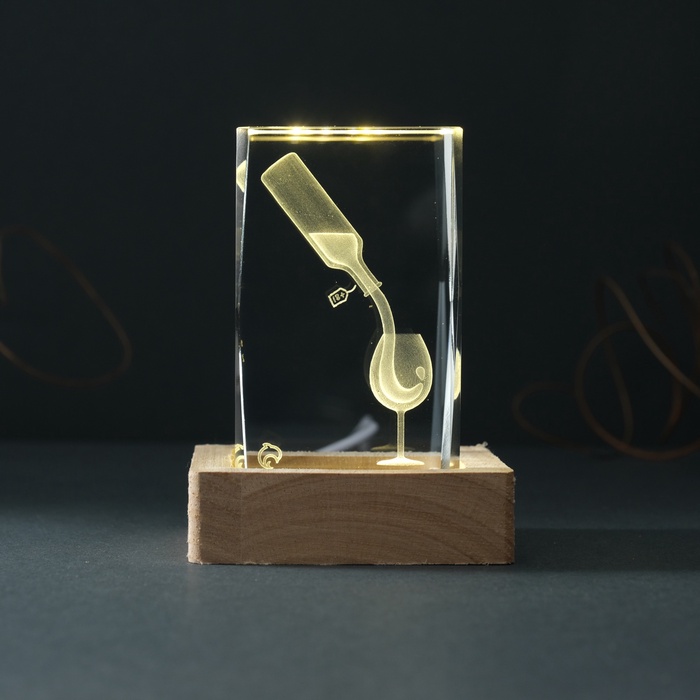 Фигурка светящаяся стекло «Прямоугольник. Бокал и вино», подставка дерево, USB, 7×7×10