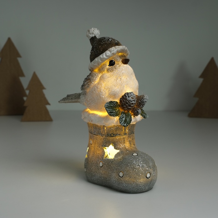 Фигурка светящаяся «Воробышек в колпаке сидит на новогоднем сапоге», серый, 7.6×9.5×15 см