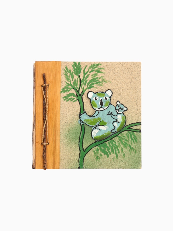 Квадратный фотоальбом в твёрдом переплёте из натурального пальмового листа с милым изображением коал. Его умиротворяющий дизайн и тёплая фактура создают уютное обрамление для фотографий о семье, спокойных моментах и нежности.