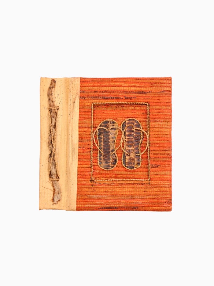 * Обложка из пальмового листа с весёлым и узнаваемым принтом в виде шлёпанцев на оранжевом фоне.