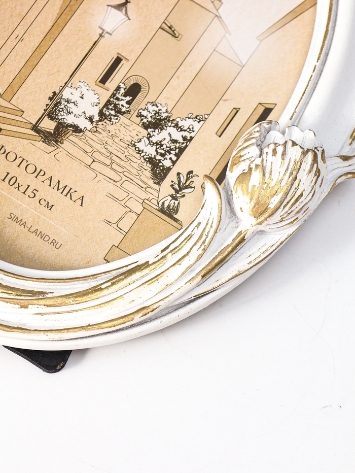 Эта элегантная фоторамка — способ сохранить самый тёплый момент. Она создана для одной, самой важной фотографии 10 на 15 см, которую вы поместите в овальное окошко. Белоснежная основа из полистоуна с золотым узором в виде махровых тюльпанов выглядит дорого и утончённо, словно фарфор. Рамка станет изысканным украшением интерьера на подставке или изящным акцентом на стене.