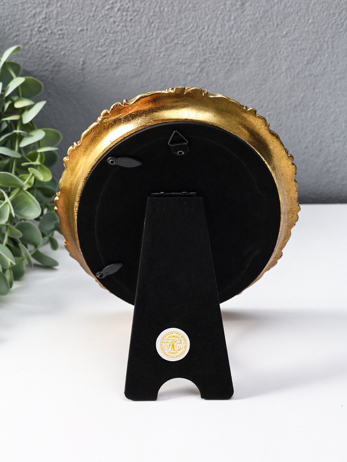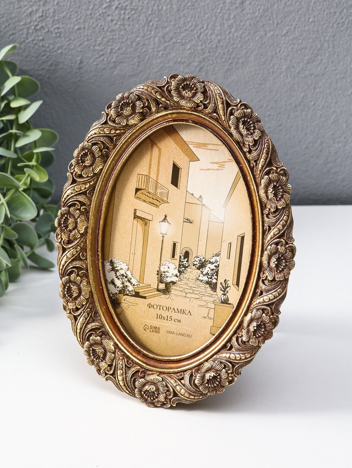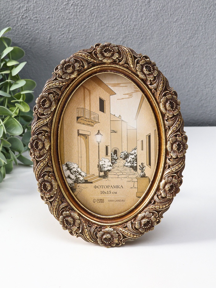 Эта винтажная фоторамка — элегантный акцент для ваших самых тёплых воспоминаний. Изящный овал для фотографии 10 на 15 обрамлён рельефным узором из цветов и листьев, отлитым из прочного полистона с благородным золотистым покрытием. Защитное стекло надёжно сохранит снимок, а двойной крепёж — подвес и подставка — даёт свободу в оформлении интерьера. Эта рамка станет трогательным подарком на свадьбу или изысканным дополнением домашнего декора в классическом стиле.