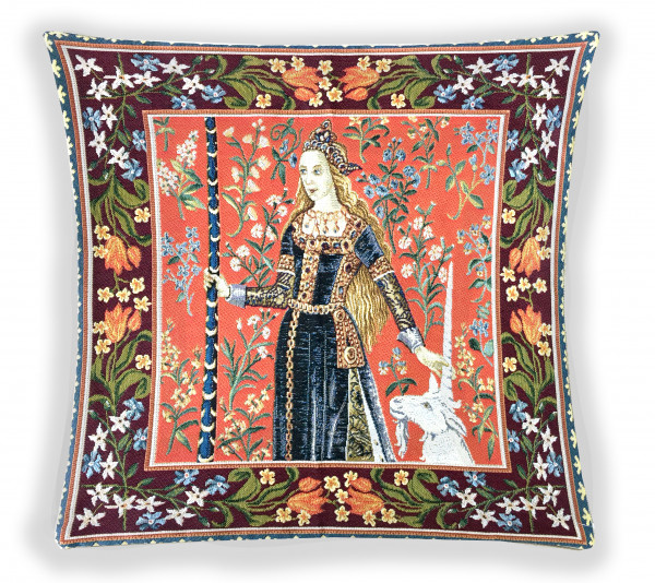 На гобеленовом чехле изображен аллегорический сюжет. Дама в платье старинной эпохи, одной рукой держит за рог единорога, другой древко штандарта.