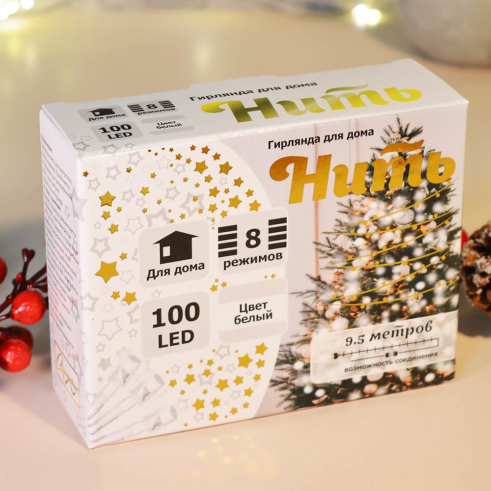 Гирлянда электрическая 9,5м, 100 ламп LED, прозрачный провод, 8 режимов, белый свет