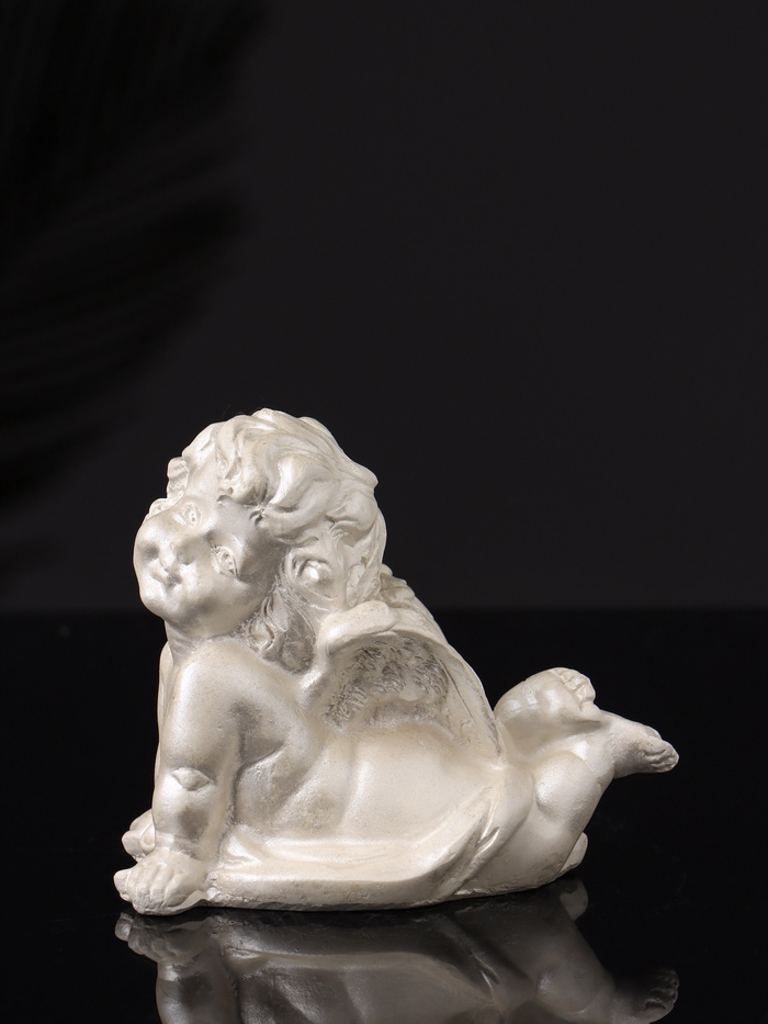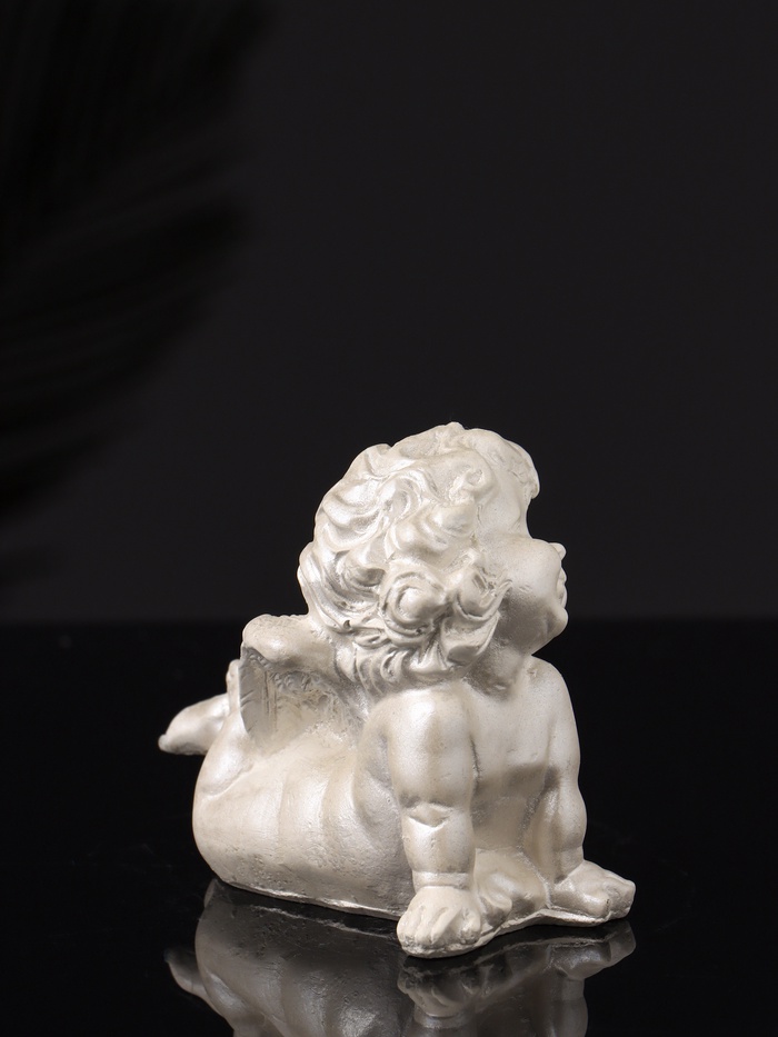В этой изящной фигурке запечатлен момент безмятежности и нежности. Ангел, удобно расположившийся на животе, словно прислушивается к тихому шепоту зимнего утра или весеннего ветерка.