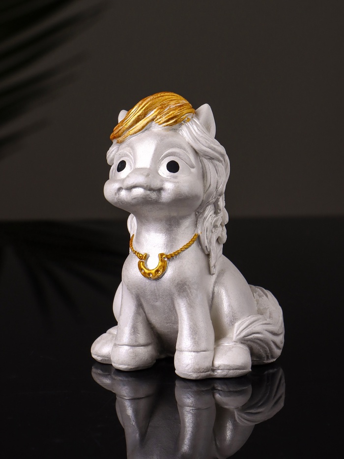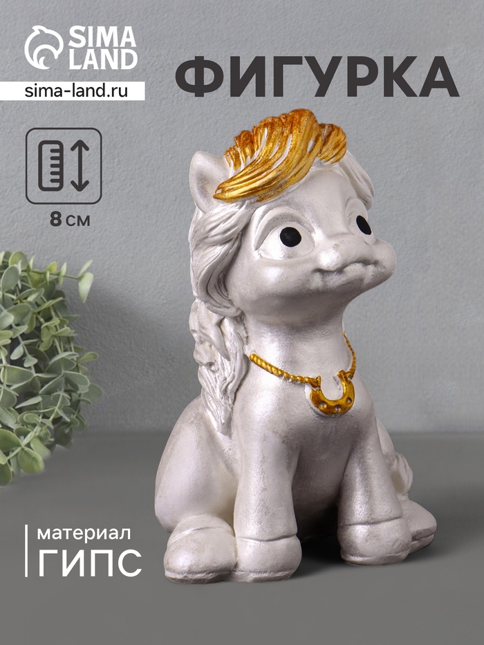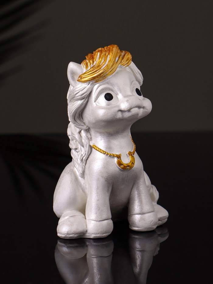 Откройте для себя удивительный мир волшебства и радости с этой очаровательной фигуркой, изображающей пони с подковой. Выполненная из высококачественного гипса и окрашенная в белый и золотистый цвета, эта миниатюра размером 8×5×5 см станет ярким акцентом в вашем интерьере и источником вдохновения для всех, кто её увидит.
