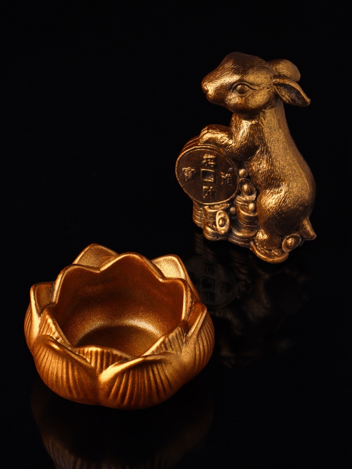 Изделия изготовлены из высококачественного гипса с эффектом «под бронзу», что гарантирует их долговечность и устойчивость к внешним воздействиям. Компактные размеры (12×20 см) делают набор идеальным для размещения на полке, столе или в нише, где он будет привлекать внимание своей изысканностью. Фигурка кролика, дополненная элементами лотоса, создает атмосферу спокойствия и баланса, что особенно ценно для поклонников философии фен-шуй.