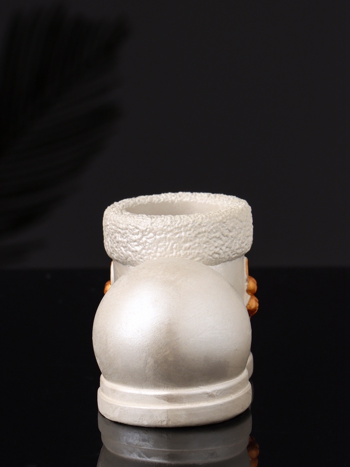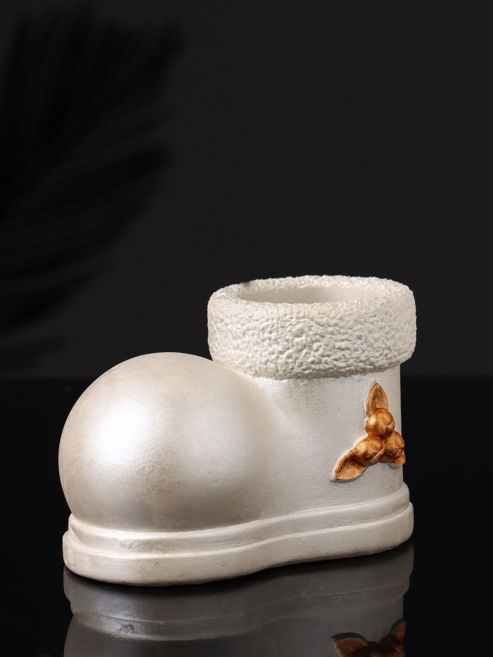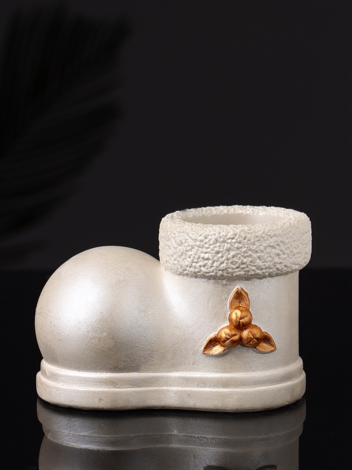 Изящный подсвечник в форме традиционного валенка станет стильным акцентом в вашем новогоднем или рождественском интерьере. Его перламутровое покрытие придаёт изделию лёгкое мерцание и глубину, создавая атмосферу волшебства и тепла в зимние вечера. Компактные размеры 10×7×6 см позволяют разместить подсвечник на столе, камине или полке, добавляя уют и праздничное настроение.