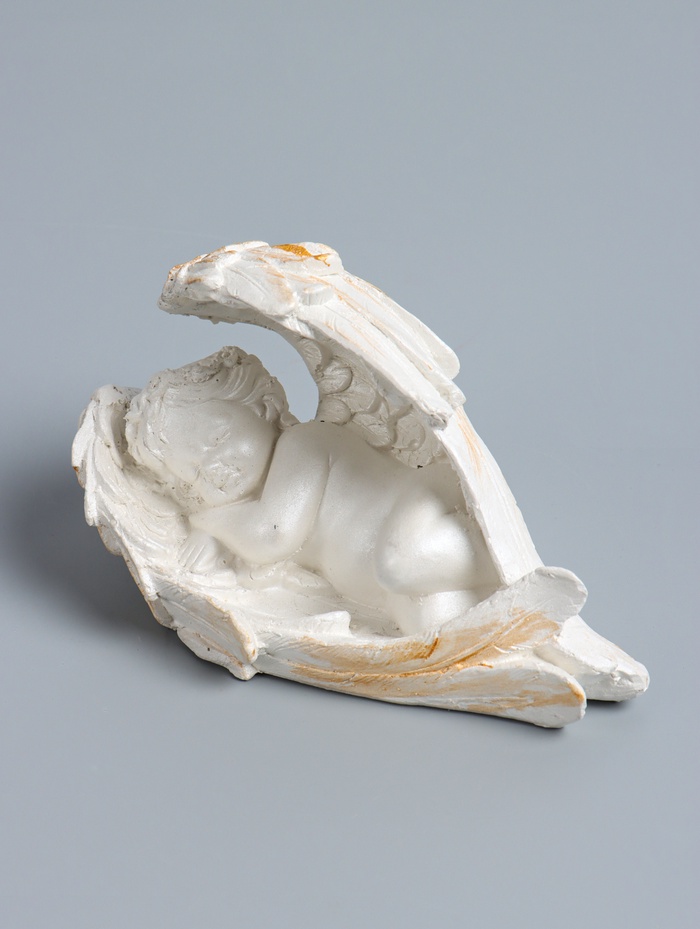 Эта белая гипсовая фигурка спящего ангела создаёт атмосферу умиротворения и нежности. Перламутровое сияние поверхности придаёт образу лёгкость и чистоту. Станет глубоким духовным подарком к Пасхе или трогательным знаком внимания на День влюблённых.