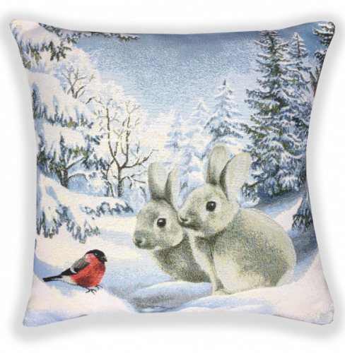 Декоративная подушка, где изображен деловой хозяин зайка, малыш в одной лапе и поварёшка в другой. Такой гобеленовый чехол прекрасно подойдет в детскую комнату, гостиную.