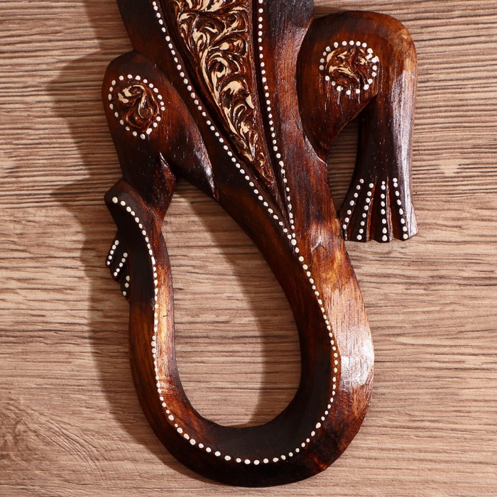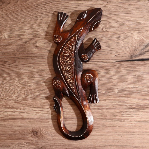 Не каждый осмелится разместить такое панно ручной работы в своем интерьере. Ведь порой кажется, что это настоящая живая рептилия. Искусные индонезийские мастера изобразили всё настолько детализировано четко, что хочется прикоснуться к ##name## и ощутить тонкие линии изгибов этой «ящерицы счастья».