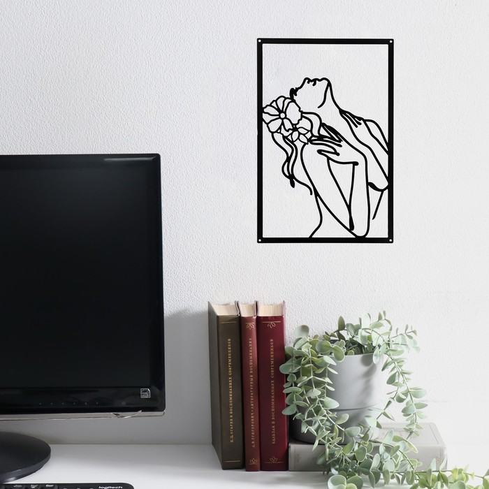 Это настенное панно — лаконичный и выразительный акцент для интерьера. Чёрный силуэт девушки с цветком в волосах, выполненный из металла, создаёт изящный контраст на светлой стене. Абстрактная форма дарит простор для воображения, а универсальная тематика делает декор уместным в любой комнате: от гостиной до спальни.