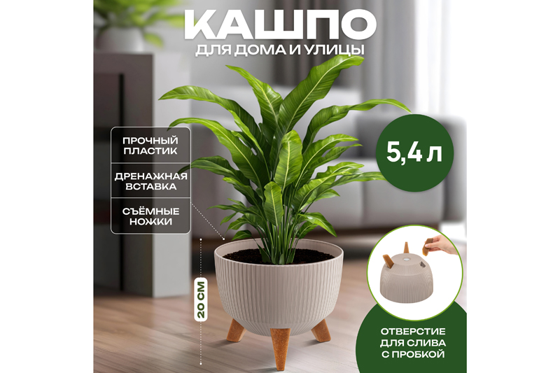 Кашпо 24×24×20 см тёмно-бежевого цвета от бренда ELCASA — это удобное интерьерное решение для квартиры или дачи. Можно использовать как напольное или настольное. Объём ёмкости 5,4 литра. Имеет подставку в виде съёмных ножек высотой 7,5 см. Без ножек высота кашпо 15 см. Внутри оснащено дренажной вставкой круглой формы размером 21×21×4,5 см. На дне бежевого горшка есть отверстие для слива излишков воды, плотно закрывается пробкой. Это удобно при поливе комнатных цветов и садовых композиций из живых растений, так как можно избавиться от застоя воды. Изделие выполнено из прочного и экологичного пластика – полипропилена. Материал устойчив к влаге и другим внешним воздействиям, благодаря чему цветочный горшочек можно использовать на улице. Подойдёт для украшения живыми цветами сада, балкона или террасы. Ножки приподнимают горшок с цветком над поверхностью, поэтому он эстетично смотрится на подоконнике, столе и даже на полу. Создайте уютную зону отдыха в любом помещении, украсив её декоративными растениями. Благодаря универсальному дизайну подойдёт под любой стиль интерьера городской квартиры, а также гармонично впишется в атмосферу загородного участка как уличное кашпо. Не рекомендуется применять абразивные моющие средства. Беречь от механических повреждений. Станет приятным подарком на любой праздник. В коллекции бренда ELCASA представлено много функциональных товаров для дома, садоводства и предметов декора. Выберите варианты на свой вкус! /