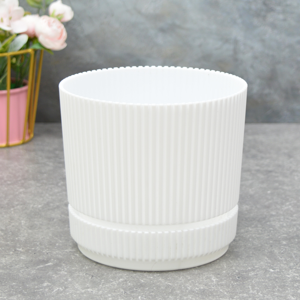 Кашпо Стрип 1,3л d14см с подставкой, белыйЭффектная фактура на стенках кашпо создаёт красивые блики на поверхности, впечатляет, увлекает и завораживает.Кашпо состоит из двух частей: корпуса и поддона — используется для сбора лишней воды. На кашпо между корпусом и поддоном есть щель, благодаря которой лишняя вода испаряется и не застаивается.Объем - 1,3 л.Заключаем договора по 44 ФЗ, 223 ФЗ
