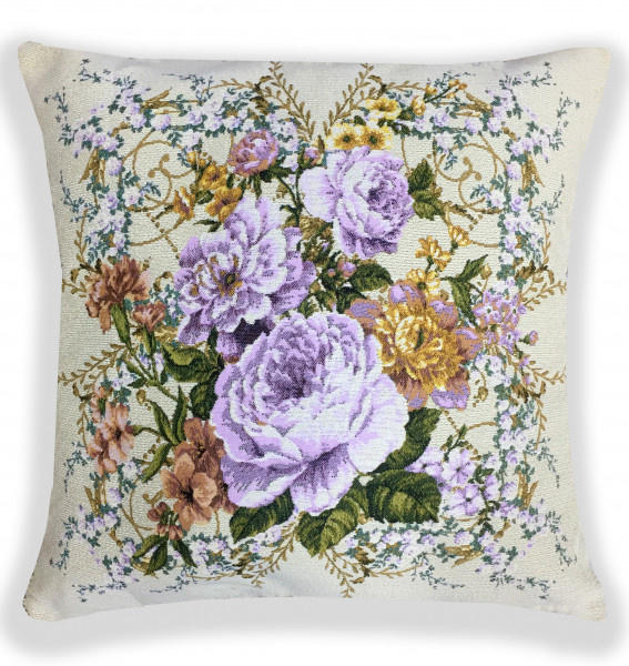 Гобеленовый чехол выполнен в светлых, пастельных оттенках, в середине крупные сиреневые пионы, все на фоне маленьких цветочках вперемежку с листочками.