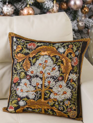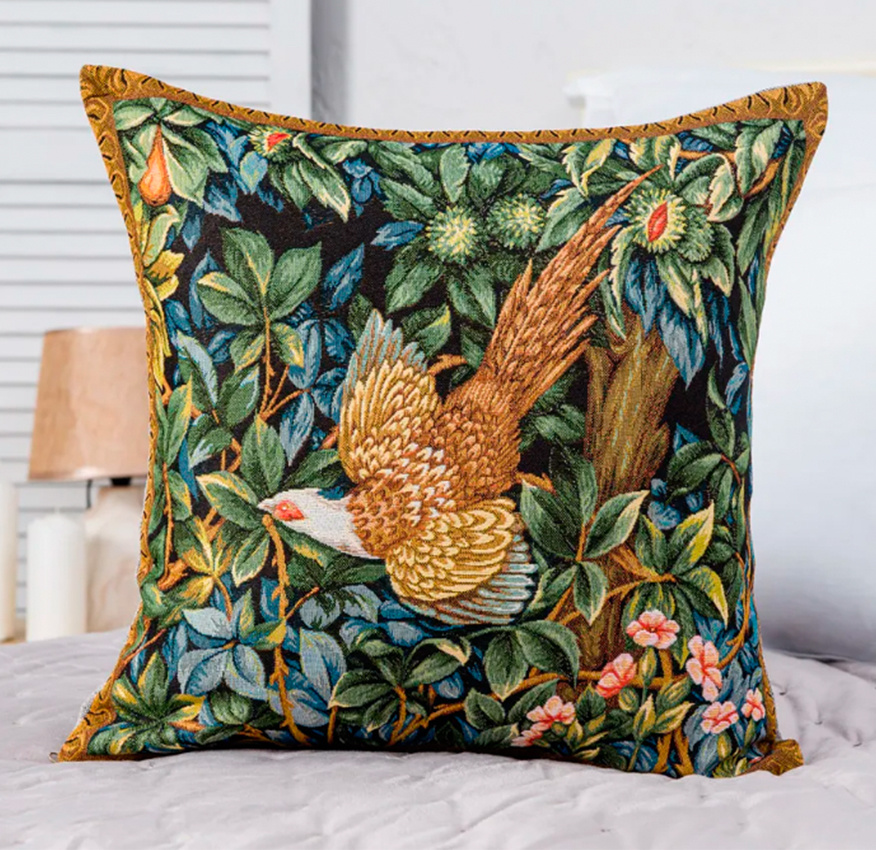 Декоративный гобеленовый чехол на подушку с односторонним рисунком из фрагмента знаменитого сюжета дизайнера Уильяма Морриса "Лесные обитатели" на молнии. Изображение выполнено с использованием жаккардового переплетения. Преимущество гобеленовой ткани - сохранность цвета.
