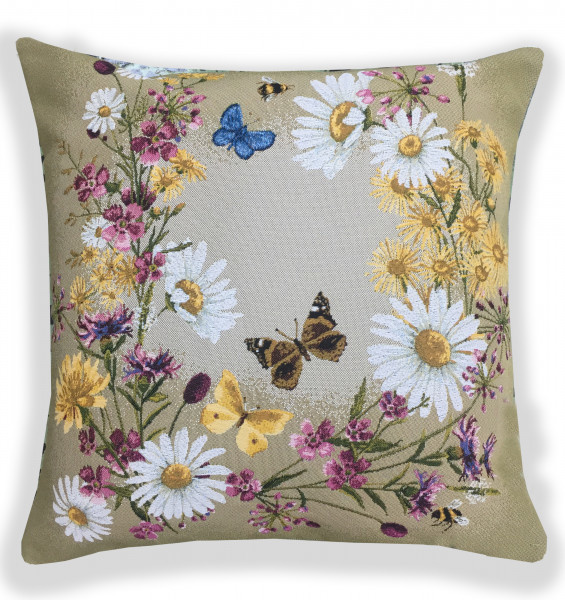 На гобеленовой наволочке светлого фона расположены цветы пастельных тонов, на которые прилетели бабочки и шмель. Создавая иллюзию, что находишься в поле, где слышаться звуки различных насекомых.