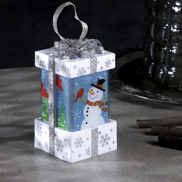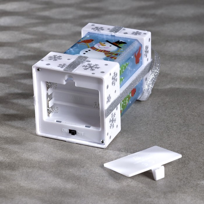 Светодиодная фигура «Белый подарок со снеговиком» 6.3×11.5×6.3 см, пластик, от батареек АААх3, эффект пламени