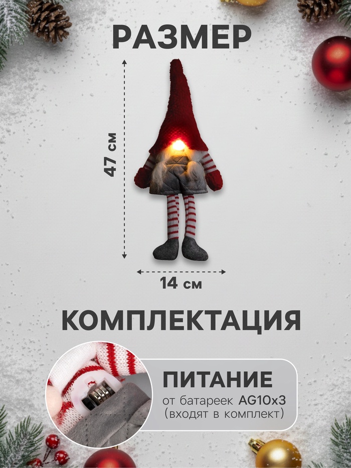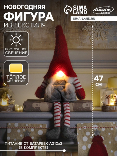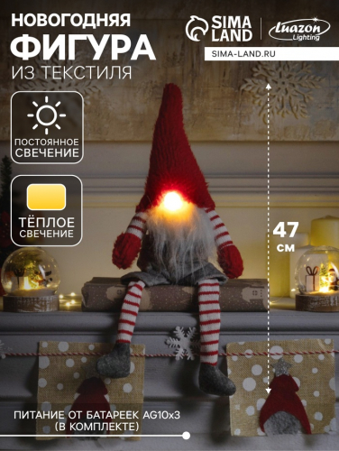 Светодиодная фигура «Гном с усами» 14×47×9 см, текстиль, от батареек AG10×3, свечение тёплое белое