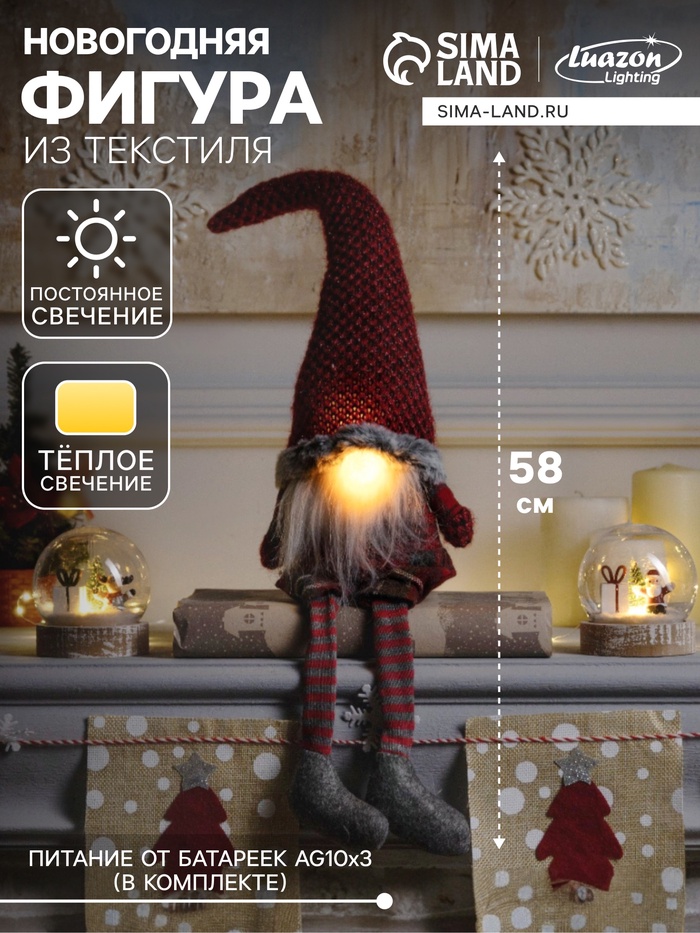 Светодиодная фигура «Гном в красном колпаке» 13×58×8 см, текстиль, от батареек AG10×3, свечение тёплое белое