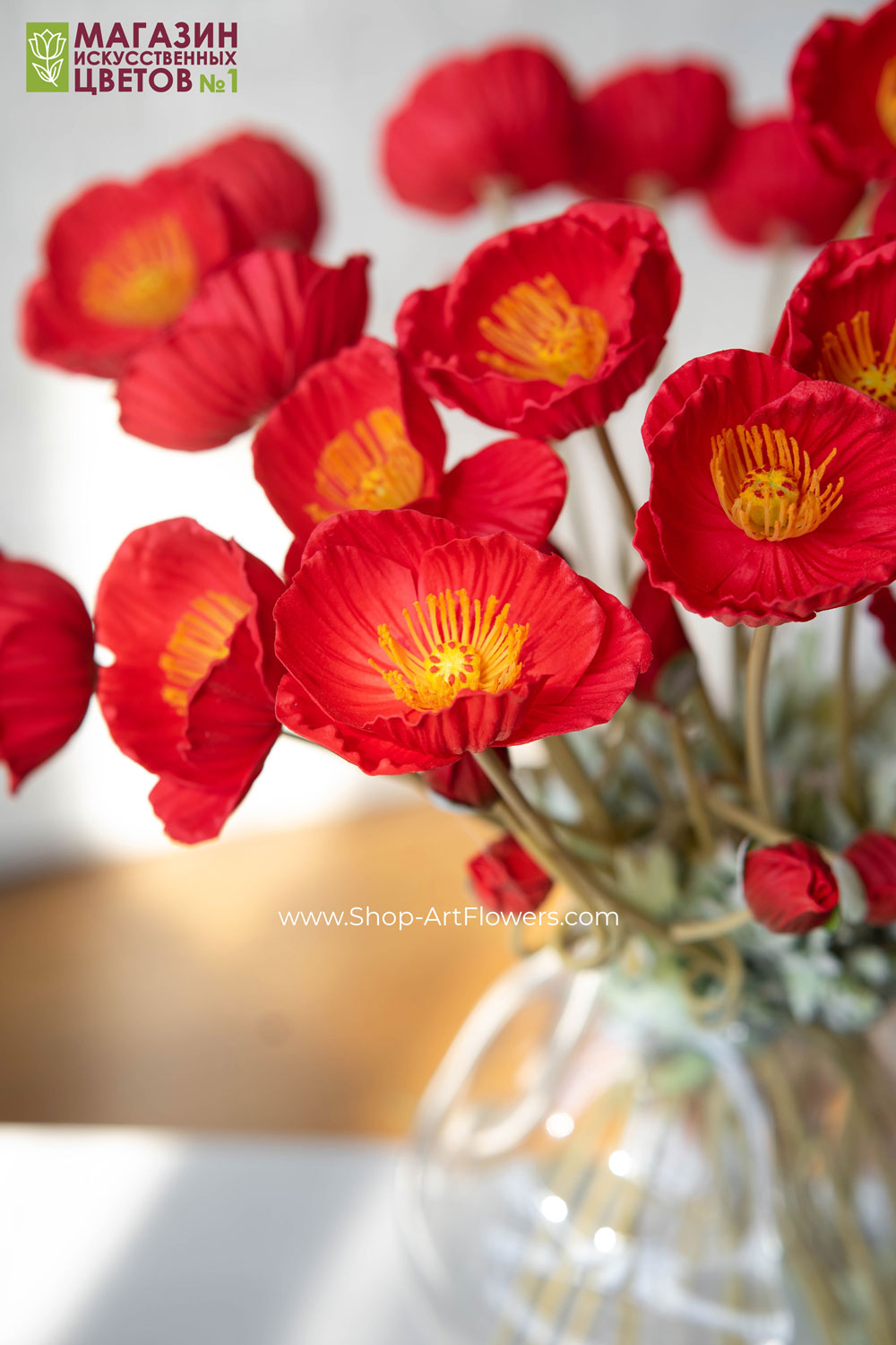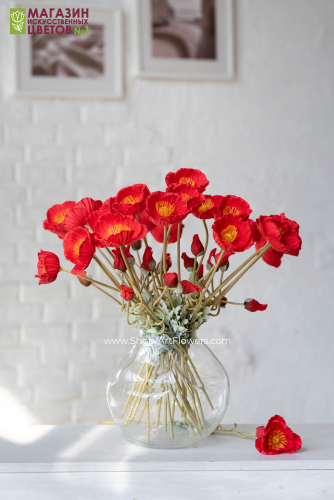 Искусственные декоративные цветы не требуют постоянного ухода. Пыль достаточно сдувать холодным воздухом фена или протирать влажной салфеткой. После распаковки букета рекомендуем отпарить цветы, подержав их немного над паром, расправить лепестки и листья руками. Праздничный букет маков замечательно смотрится как самостоятельно в вазе из стекла и керамики, так и в составе цветочных композиций для интерьера. Красиво будет сочетаться с полевыми цветами: ромашки, космея, лаванда и сухоцветами. Ветки маков подойдут как многоразовый декор на фотосессию, для создания фотозоны. Это предмет интерьера для кафе и ресторана, цветы в отель и офис. Красивые букетики помогут украсить день рождения и любой праздник. Подходят и как ритуальные цветы на кладбище, на могилу. Флористы-декораторы склонны больше доверять искусственным цветам премиум класса для дизайна и создания композиций в кашпо и корзинках, венков, фито панно, арок.