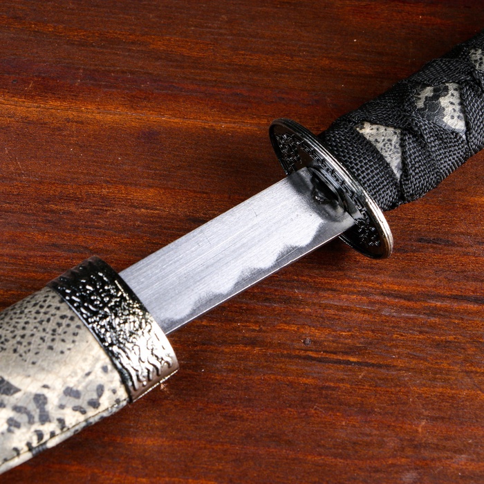 Подарите себе или своим близким уникальный элемент декора — это элегантная сувенирная катана на подставке. С длиной лезвия 19 см и бежевыми ножнами, оформленными под змеиную кожу, этот аксессуар станет настоящей находкой для ценителей восточной культуры и эстетики.