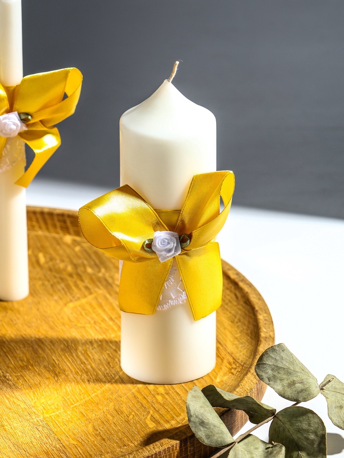 Исполненные из качественного парафина, эти свечи горят ровно и продолжительно, символизируя прочность семейных уз. Их классическое бело-золотое сочетание гармонично впишется в любую свадебную палитру — от роскошной до минималистичной, добавляя церемонии элегантности и завершённости.