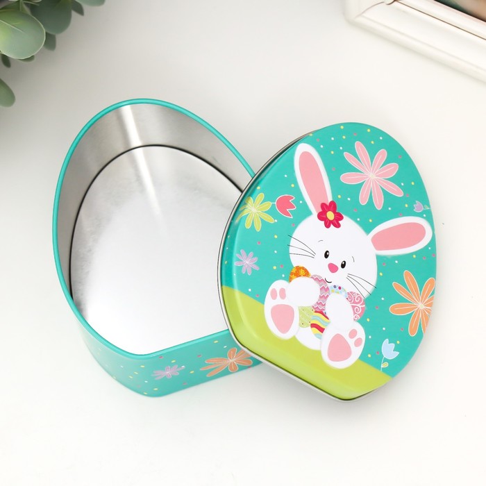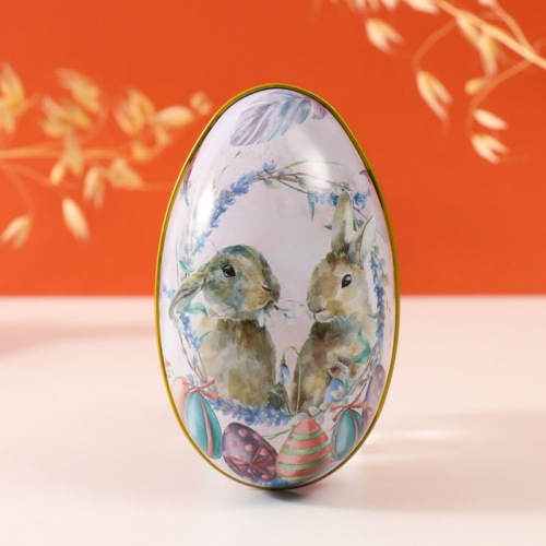 Металлическая шкатулка - яйцо «Зайчик с охапкой раскрашенных яиц», для украшений, хранения мелочи, 11.7×9.2×4.5 см