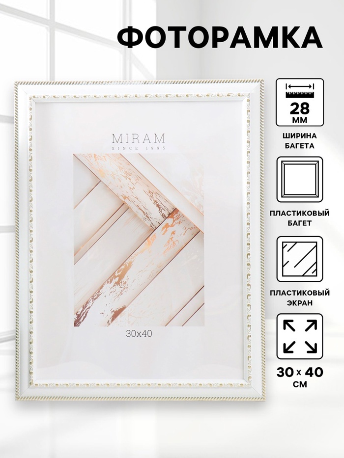 Фоторамка для фото 30×40 см «МИРАМ», пластик, белый, (пластиковый экран)