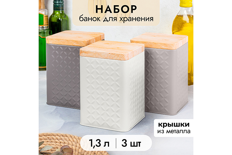 Набор 3 банок для хранения с металлическими крышками от бренда Elan Gallery по 1,3 литра станет удобным дополнением вашей кухни. В комплект входят высокие баночки в стильной палитре белого, светло-серого и тёмно-серого цветов. Размер каждой – 10,5х10,5х16 см. Металлические крышки имеют необычный дизайн: рисунок имитирует деревянную поверхность. Благодаря реалистичному изображению на поверхности крышка сочетает прочность металла с природной эстетикой. Она плотно фиксируется на банке за счёт своей формы: вставляется внутрь по принципу пробки. Основание крышечки, которое вставляется в банку, тоже металлическое. Такая модель крышки обеспечивает плотное прилегание и не нуждается в дополнительных уплотнителях. Квадратные ёмкости выполнены из металла с пудровым покрытием и украшены геометрическими рельефными узорами в форме ромбиков. Стеночка каждого ромбика на узоре напоминает узкий выпуклый листочек. Металлические ёмкости позволят красиво хранить сыпучие продукты на полке или в шкафу. Понравятся любителям жестяных банок, так как данные контейнеры из металла тоже достаточно лёгкие по весу. Благодаря стильному дизайну подходят для эстетичного хранения на столе, а также для сервировки конфет, печенья и других сладостей. Комплект трёх прямоугольных контейнеров позволит не просто хранить чай, кофе и сахар на вашей кухне, но и станет элементом её декора. Кухонные баночки подойдут к интерьеру в любом стиле и обеспечат удобный доступ к крупам, соли или макаронам. Не рекомендуется применять абразивные моющие средства. Нельзя использовать в микроволновой печи и посудомоечной машине. Поставляются в стильной картонной коробке. Набор посуды из 3 предметов станет украшением кухни или приятным подарком на любой праздник. Благодаря красочной коробочке не потребуется подарочная упаковка. В коллекции бренда Элан Галерея представлено много кухонных органайзеров, сахарниц, столового инвентаря и других стильных товаров для дома. Выберите вариант на свой вкус. /