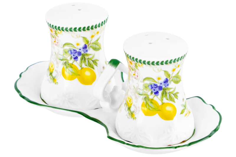 Набор для специй из серии «Лимоны» предназначен для организации хранения продуктов на вашей кухне. Включает в себя перечницу и солонку. Размер каждого изделия – 5,4х5,4х6,7 см, объём – 50 мл. Общий размер набора – 16,5х9х7,5 см. Выполнены из фарфора new bone china, сочетающего в себе изящность и высокую прочность. За счёт гладкости изделия легко отмываются, поэтому долго сохраняют привлекательный вид и практичны в использовании. Плотная структура материала позволяет посуде дольше сохранять температуру блюд и напитков. От других видов костяного фарфора new bone china отличается большей экологичностью в производстве. Фарфоровая посуда с ярким рисунком в виде лимонов станет изящным дополнением интерьера любой кухни или столовой. Ёмкости необычной формы позволят держать под рукой все необходимые во время приготовления еды специи и приправы. Фарфоровые контейнеры наполняются через отверстие снизу и закрываются пластиковой пробкой. Поставляются на фарфоровой подставке: удобная ручка позволит подавать её к столу, а углубления под ёмкости обеспечат их устойчивость при переноске. Не рекомендуется применять абразивные моющие средства. Подходит для использования в посудомоечной машине. Поставляется в красивой картонной коробке – благодаря ей вам не потребуется дополнительная подарочная упаковка. Набор станет оригинальным подарком для любой хозяйки и незаменимым элементом сервировочного инвентаря в вашем доме! /