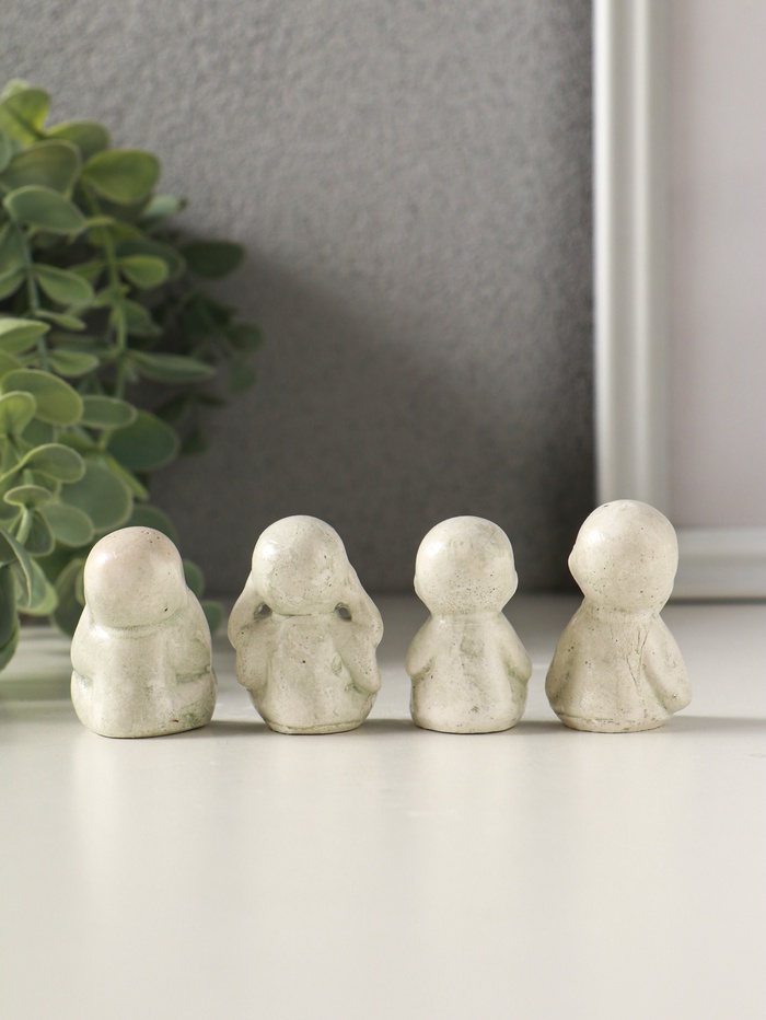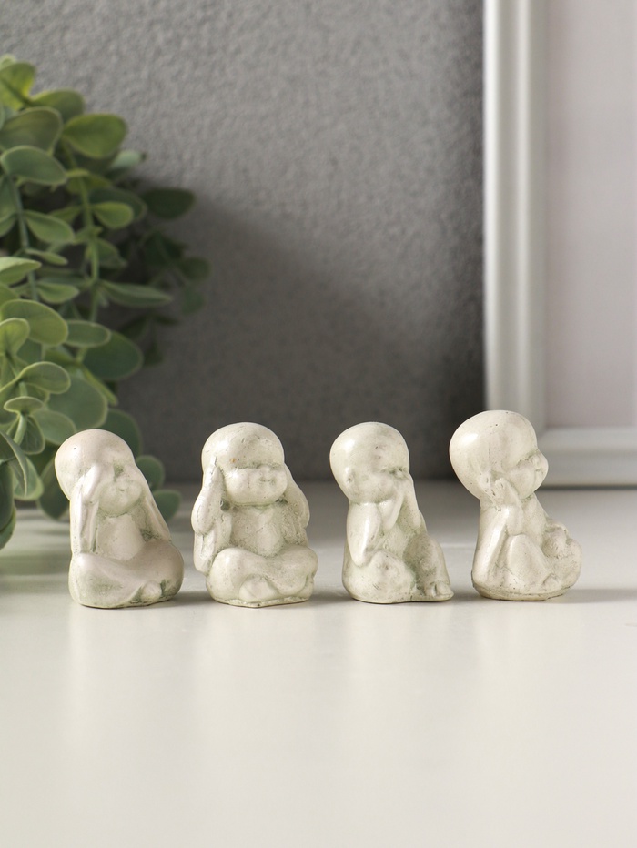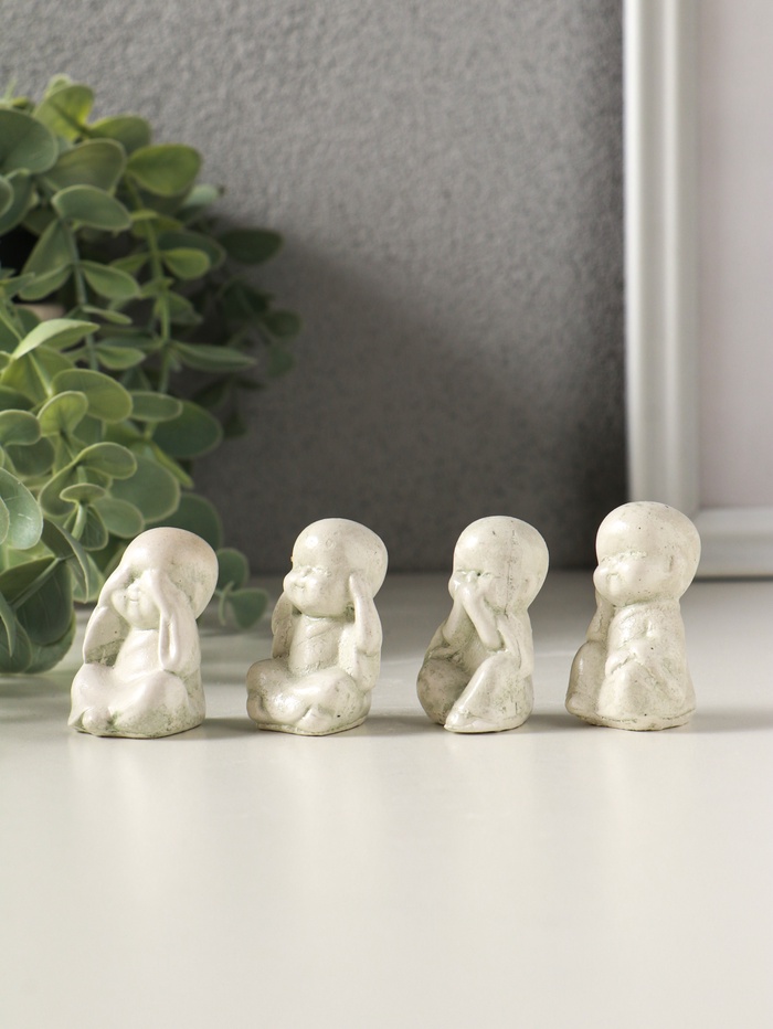 Набор из четырёх гипсовых фигурок монахов — это лаконичный символ мудрости и самоограничения. Универсальный белый цвет и классическая форма делают их идеальным элементом для оформления пространства, где ценится гармония и смысловая глубина.
