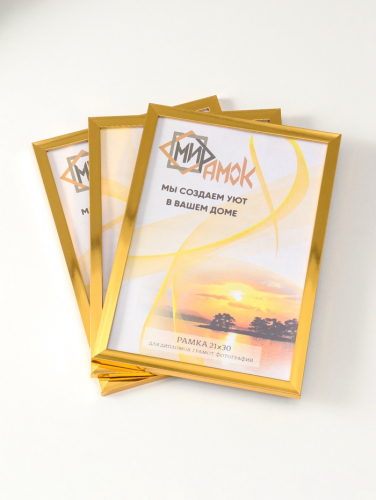 Три классические рамки для фотографий формата А4. Золотистый цвет и лаконичный дизайн превращают ваше изображение в готовый элемент декора. Идеальный способ сохранить и показать важный момент — диплом, постер, детский рисунок или памятную фотографию.