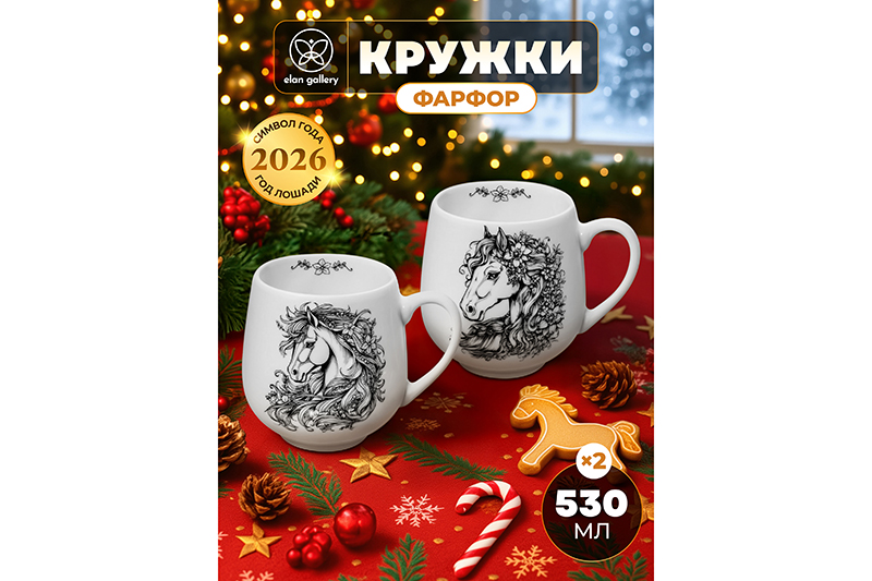 Набор 2 кружек от бренда Elan Gallery "Лошадки" выполнен из фарфора. Размер каждого изделия 13,5х10,5х10,7 см, объём – 530 мл. Дизайн вдохновлён грацией и красотой самого благородного животного на планете – лошади. Кружечки украшены чёрно-белыми изображениями грациозных лошадей с цветами в пышных гривах. Они помогут провести множество приятных завтраков с капучино или латте, а также уютных чайных вечеров с любимым горячим напитком. Лошадь – символ 2026 года! Её образ отражает энергию, свободу и неукротимый дух, вдохновляя на преодоление любых преград. Мы создали коллекцию новогодних и рождественских товаров для сервировки и декора, которые наполнят пространство атмосферой уюта. Изделия помогут оформить интерьер праздничными композициями и добавят нотку зимнего волшебства. Белые бокалы с изящными рисунками чёрного цвета имеют оригинальную форму бочонка. Они подходят ценителям чая и кофе, которые любят пить из красивой посуды. Фарфоровое изделие с принтом отлично подойдёт как для молока, так свежевыжатого сока и морса. Гладкие фарфоровые стеночки в отличие от керамических быстро отмываются и не впитывают цвет напитков. Кружки со стильным дизайном украсят интерьер кухни или столовой. Подойдут как женщине, так и мужчине для кофейных перерывов на работе в офисе. Можно использовать как парные. Не рекомендуется применять абразивные моющие средства. Подходят для микроволновой печи и посудомоечной машины. Набор поставляется в стильной картонной коробке. Благодаря красочной коробочке вам не понадобится дополнительная подарочная упаковка. Станет приятным подарком на праздник. В коллекции бренда Elan Gallery представлены подарочные аксессуары, сувениры и украшения с символикой коней и лошадок. Каждый подберёт оригинальный сюрприз для семьи, друзей и коллег на Новый год и Рождество. Такой подарок наполнит дом семейным теплом и духом праздника! /