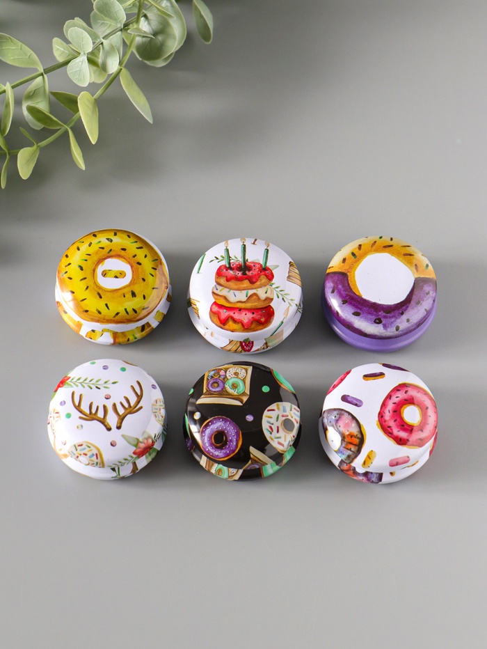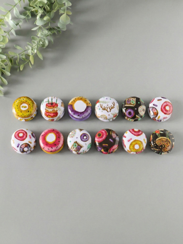 Набор из 12 мини-шкатулок для хранения мелочей — это практичное и яркое решение для порядка. Круглые металлические коробочки с сочным покрытием напоминают аппетитные пончики. Они помогают организовать мелкие украшения, швейную фурнитуру, канцелярские скрепки или коллекционные предметы. Компактный размер каждой шкатулки экономит место в ящике косметического столика или на рабочем органайзере.
