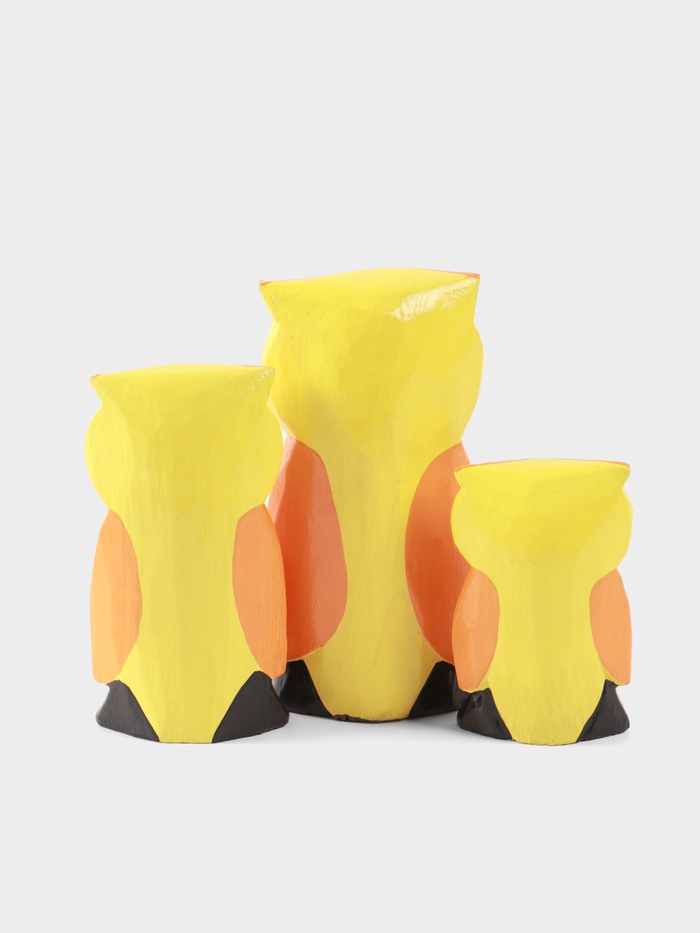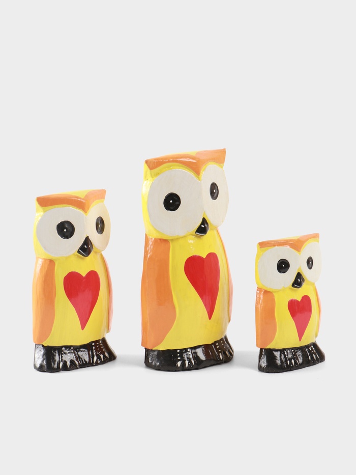 Набор деревянных фигурок «Совята с сердечком» в теплых оранжево-желтых тонах — очаровательное украшение для любого дома. Три совушки разной высоты (9.5, 12.5 и 15 см) из натурального дерева с милыми сердечками создают уютную атмосферу. Яркий дизайн делает их уместными как в детской комнате, так и в гостиной.