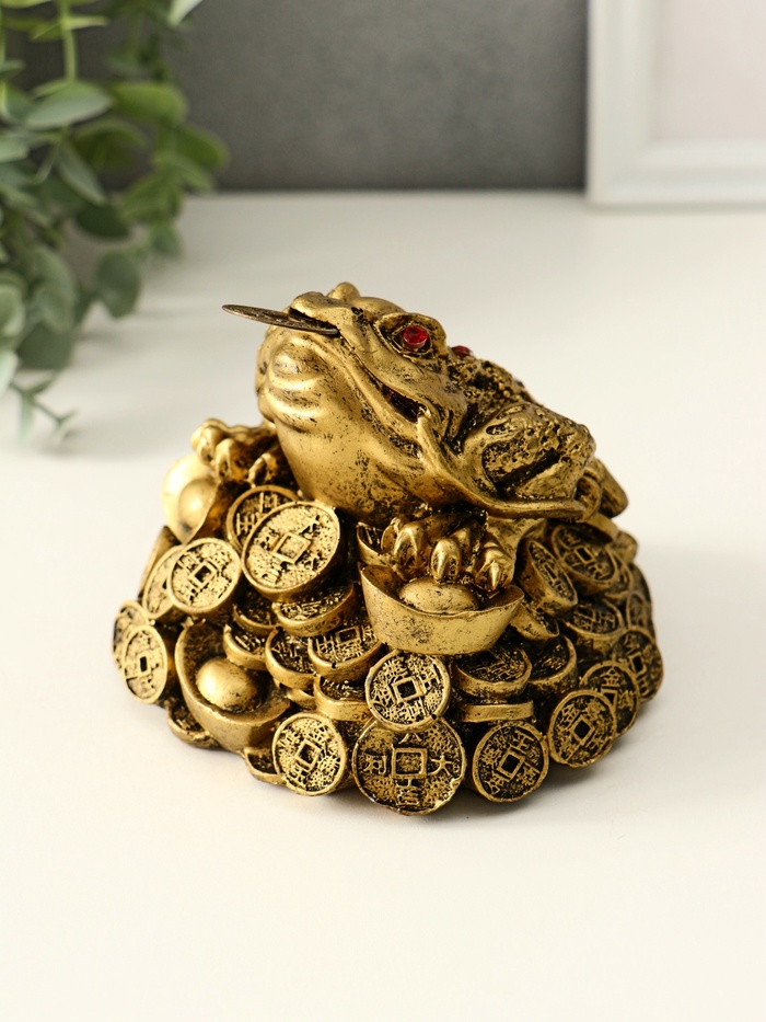 Нэцкэ фигурка «Денежная жаба на горке китайских монет», полистоун, под бронзу, 10×11.5×12.5 см