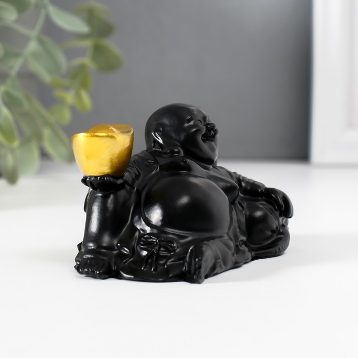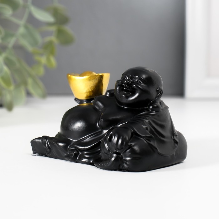 Нэцкэ фигурка полистоун «Хотей с золотым слитком, лежит на мешке», чёрный, 5×8.5×5 см