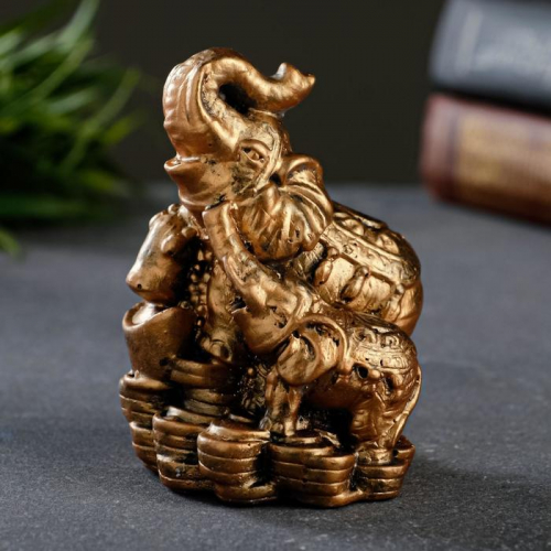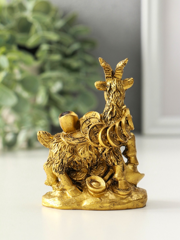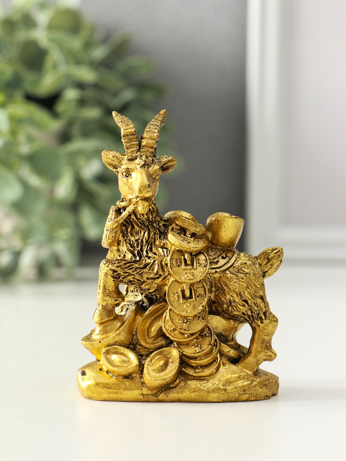 Нэцкэ фигурка полистоун «Козёл с китайскими монетами и золотыми слитками», под бронзу, 4.2×7×9.4 см