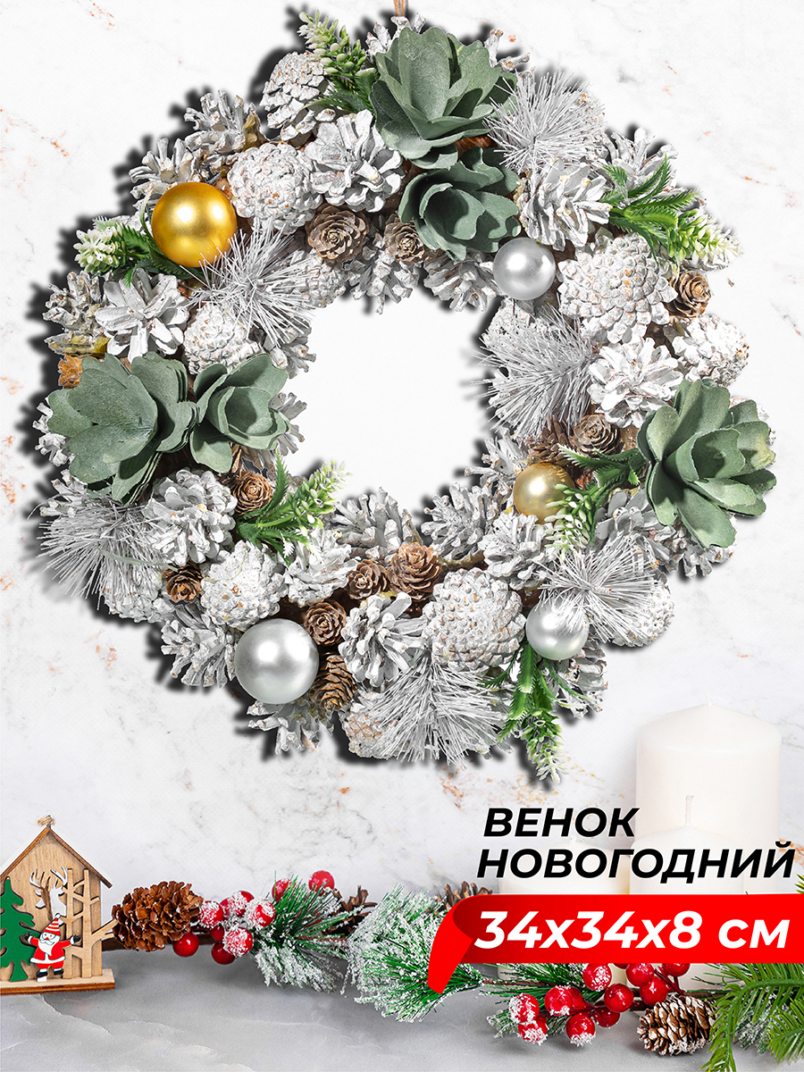 Новогоднее украшение в виде венка от бренда Elan Gallery "Снежный лес" размером 34х34х8 см подарит атмосферу сказки и волшебства вашему дому или офису! Ведь создание праздничной атмосферы начинается с украшения домашнего или офисного интерьера. Композиция из искусственных зелёных растений с серебристыми новогодними шарами притягивает взгляд гостей на вечеринке с первой минуты. Имеет круглую основу из пенопласта и петлю для подвешивания из джута. Мы создали коллекцию новогодних и рождественских товаров для сервировки и декора, которые наполнят пространство атмосферой уюта. Изделия помогут оформить интерьер праздничными композициями и добавят нотку зимнего волшебства. Венок на прочной основе украшен настоящими сосновыми шишками. Просто повесьте его дома на стену, чтобы превратить в праздник самый обычный день. Такой подвесной веночек круглой формы создаст новогоднюю атмосферу и поможет почувствовать дух Рождества в каждой квартире. Украсьте им входную дверь, придавая ей праздничный вид, чтобы тепло поприветствовать гостей. Можно использовать как настенный или настольный декор в любом помещении. С венком можно создать декоративную композицию на камине, столе или дверце. Оформление комнаты веночками создает уютную рождественскую атмосферу на празднике или семейном ужине. В коллекции бренда Elan Gallery представлены посуда, сувениры и украшения с новогодней символикой. Каждый подберёт оригинальный сюрприз для семьи, друзей и коллег на Новый год и Рождество. Такой подарок наполнит дом семейным теплом и духом праздника! /