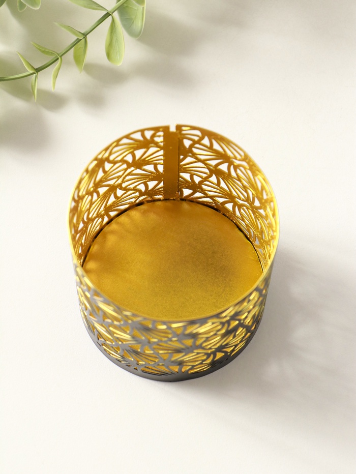 Этот чёрный металлический подсвечник с золотым декором — акцент для интерьера, создающий мгновенное настроение. Его лаконичная цилиндрическая форма и универсальный дизайн делают его уместным в любой обстановке: от романтического ужина до ежедневного ритуала отдыха. Установите внутрь свечу, и игра света на фактурных стенках добавит пространству глубины и тепла.