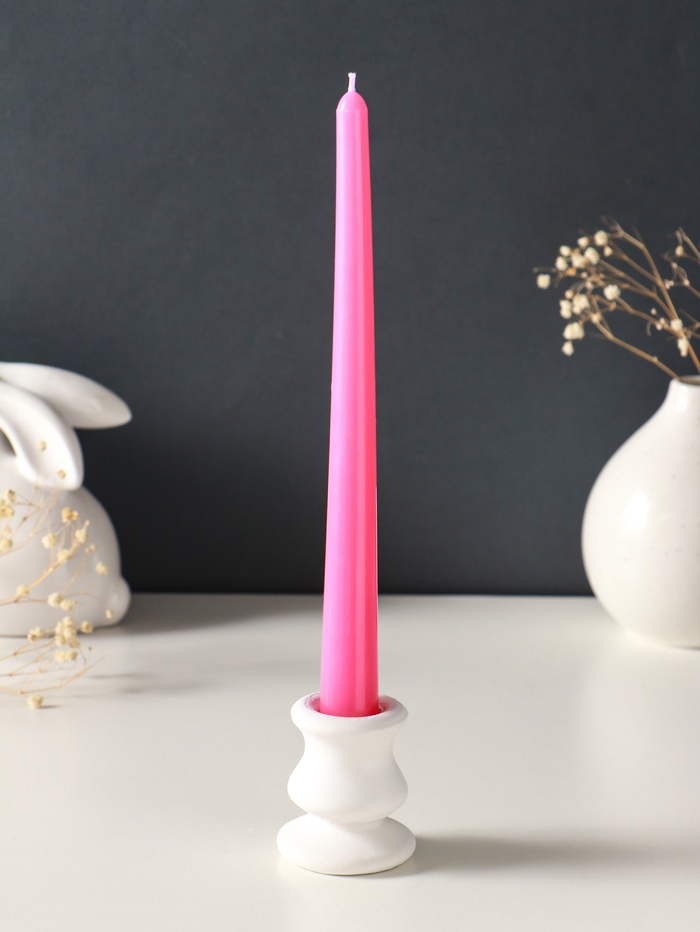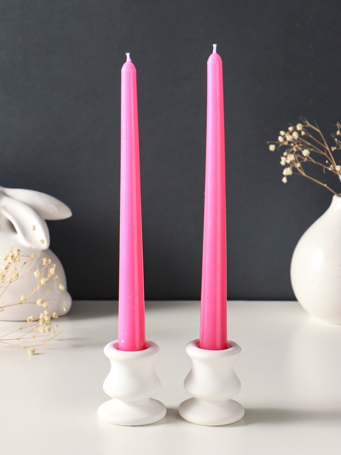 Этот набор из двух высоких розовых свечей создаёт атмосферу спокойствия и романтики. Их классическая коническая форма и глубокий оттенок делают композицию утончённой и самодостаточной. Свечи горят до пяти часов, постепенно раскрывая мягкий свет, идеальный для долгого вечера.